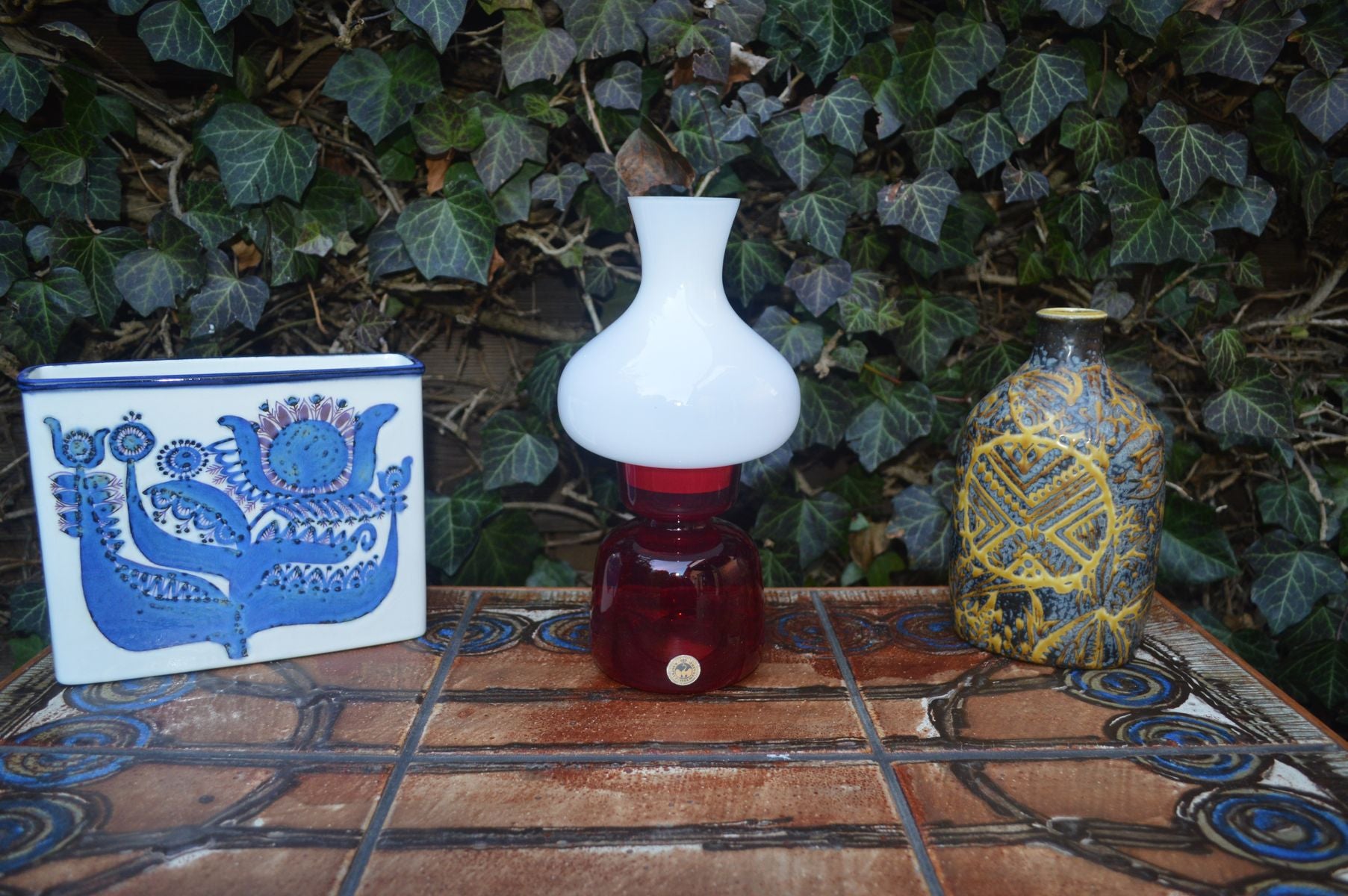 Hier habe ich diesen wunderschönen Holmegaard Hygge Kerzenhalter für Euch. Die weltbekannte Glasbläserei Holmegaard wurde im Jahr 1825 und besteht noch heute als Teil der Rosendahl Gruppe. Im Laufe der Zeit prägten viele berühmte Designer die Produktpalette von Holmegaard, so zum Beispiel Jacob E. Bang, Per Lüttken oder Michael Bang. Der Entwurf für die sogenannten Hyggelampe stammt von dem weltberühmten Designer Jacob Eiler Bang. Jacob E. Bang (1899–1965) gilt als Pionier des funktionalen Designs und war maßgeblich für das Erscheinungsbild von Holmegaard beteiligt. Der ursprünglich gelernte Architekt kam 1928 zu Holmegaard und war dort bis 1941 künstlerischer Leiter. Jacob E. Bang entwarf ca. 2000 Glasobjekte, viele Entwürfe gelten als mittlerweile als Designklassiker. Die frühsten Modelle dieser Lampen wurden 1965 zunächst noch als Havelampe, also Gartenlampe und ab 1967 dann als Hyggelampe aufgeführt. Diese organisch geformte Hyggelampe besteht aus einem Sockel aus rotem Glas und besitzt einen eleganten Lampenschirm aus weißem Glas. Das zeitlose und moderne Design dieser Kerzenhalter macht sie zu einem absoluten Klassiker des dänischen Designs.