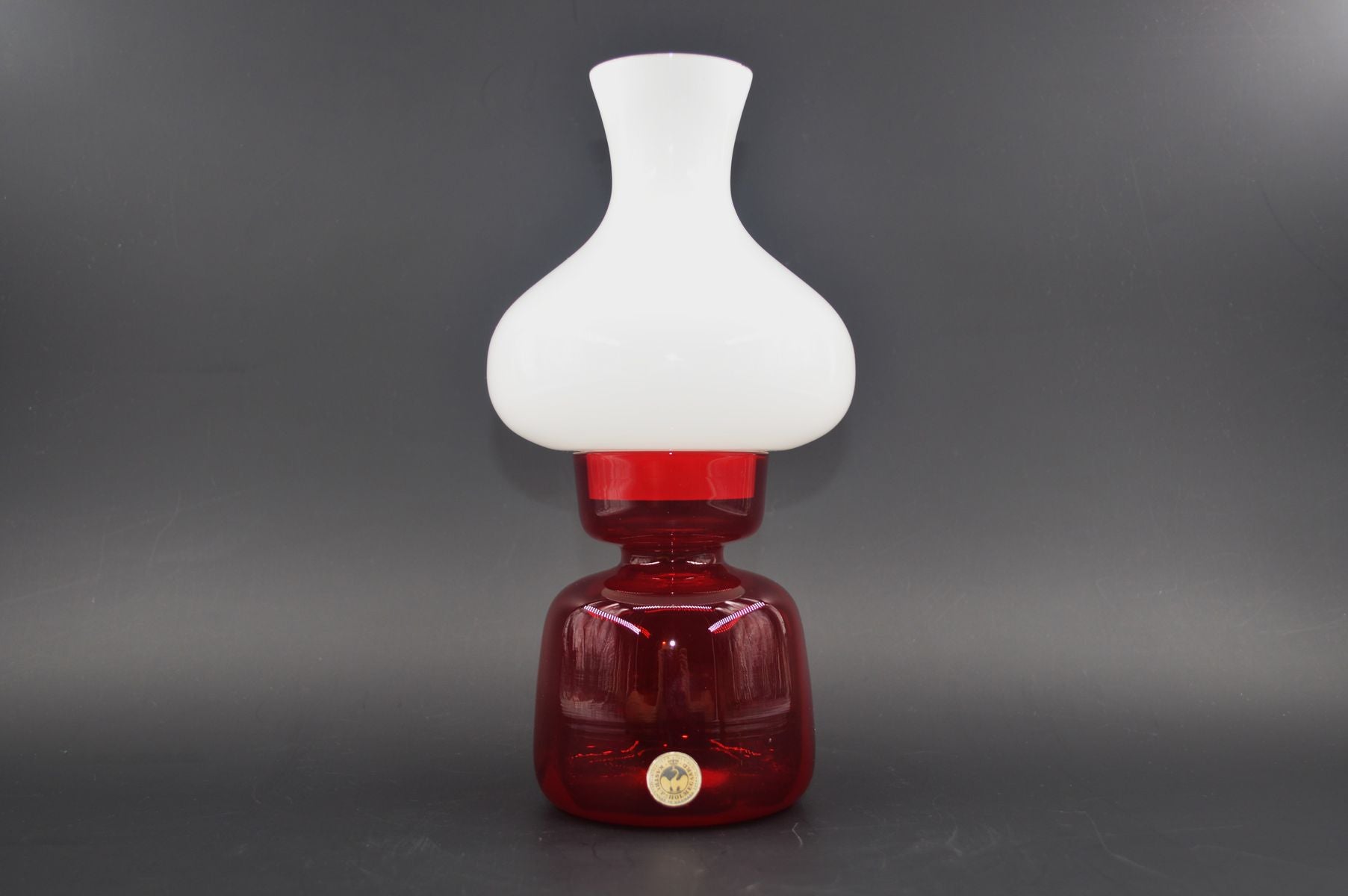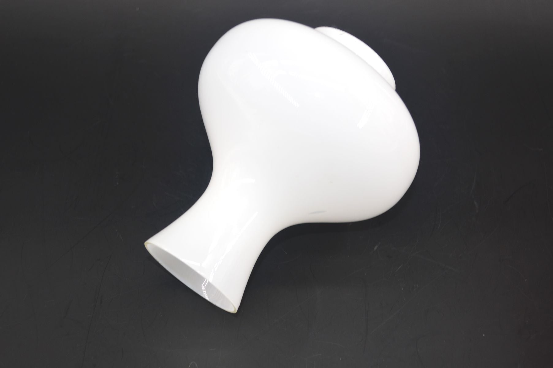 Zustand: minimaler Chip am oberen Rand des weißen Lampenschirms, ansonsten unbeschädigt mit normalen Altersspuren. Mit Herstelleraufkleber auf der Außenseite.
