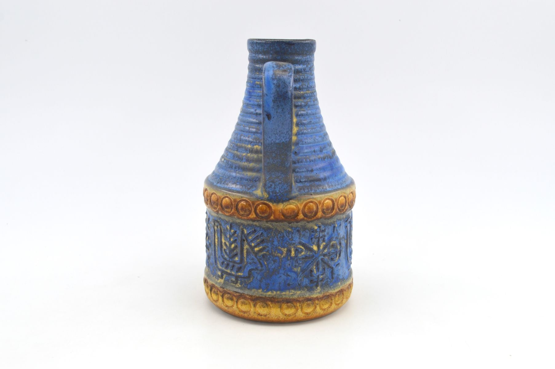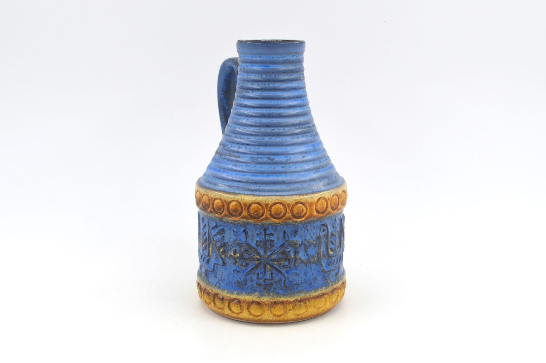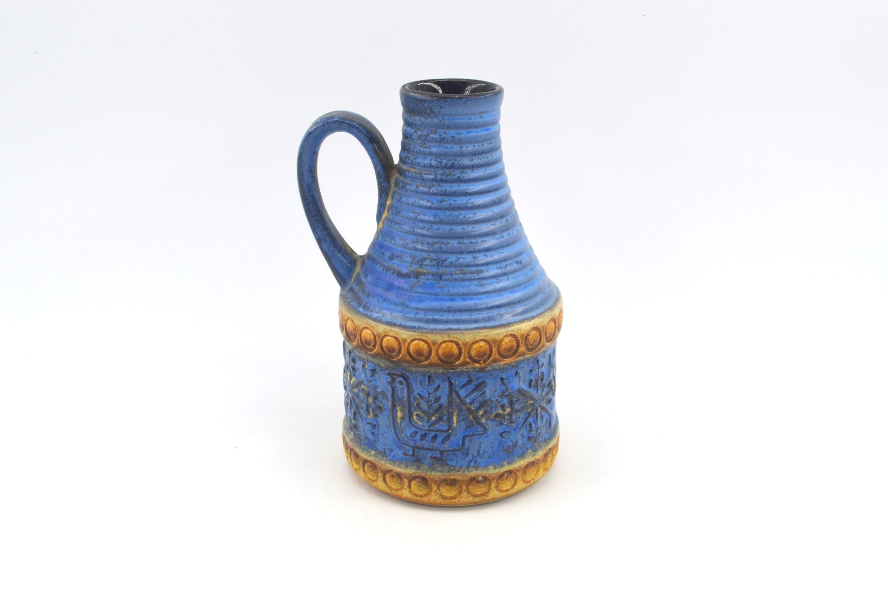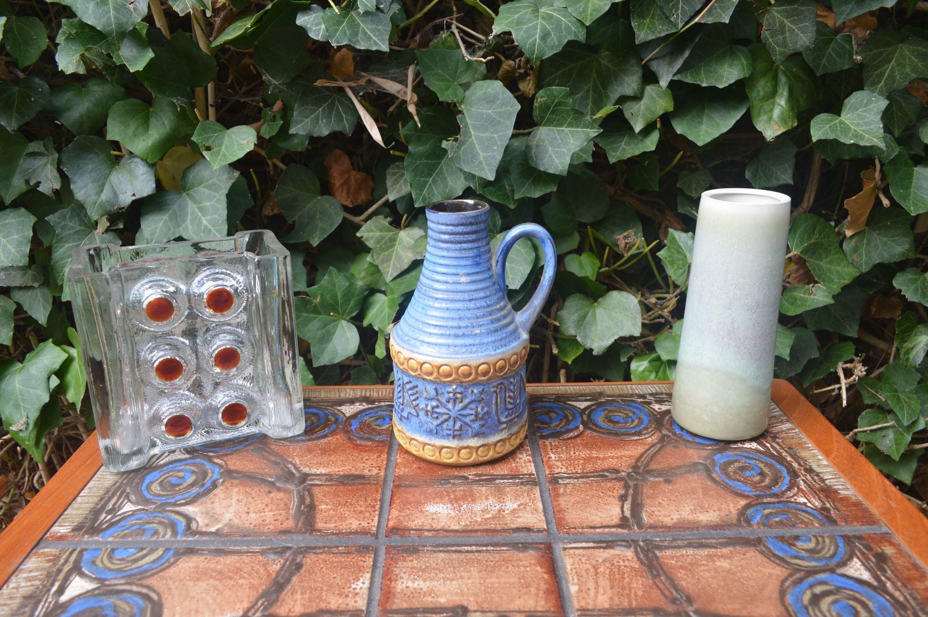 Hier habe ich diese Vase von dem westdeutschen Hersteller Bay Keramik für Euch. Das Unternehmen Bay Keramik bestand von 1933 – 1998 in Ransbach und ist für seine farbenfrohen Fat-Lava Keramiken bekannt. Der deutsche Designer Bodo Mans (1935 – 2001) entwarf diese farbenfrohe Vase, mit der Seriennummer 65-17. Durch die kräftigen Farben in kontrastreichen Gelb- und Blautönen fällt diese Henkelvase besonders ins Augenmerk. Die seltene Farbkombination macht diese zu einem Blickfang und einem farbenfrohen Akzent auf eurem Mid-Century Mobiliar. Viele weitere Keramiken aus Westdeutscher Produktion findet ihr in meinen anderen Annoncen.