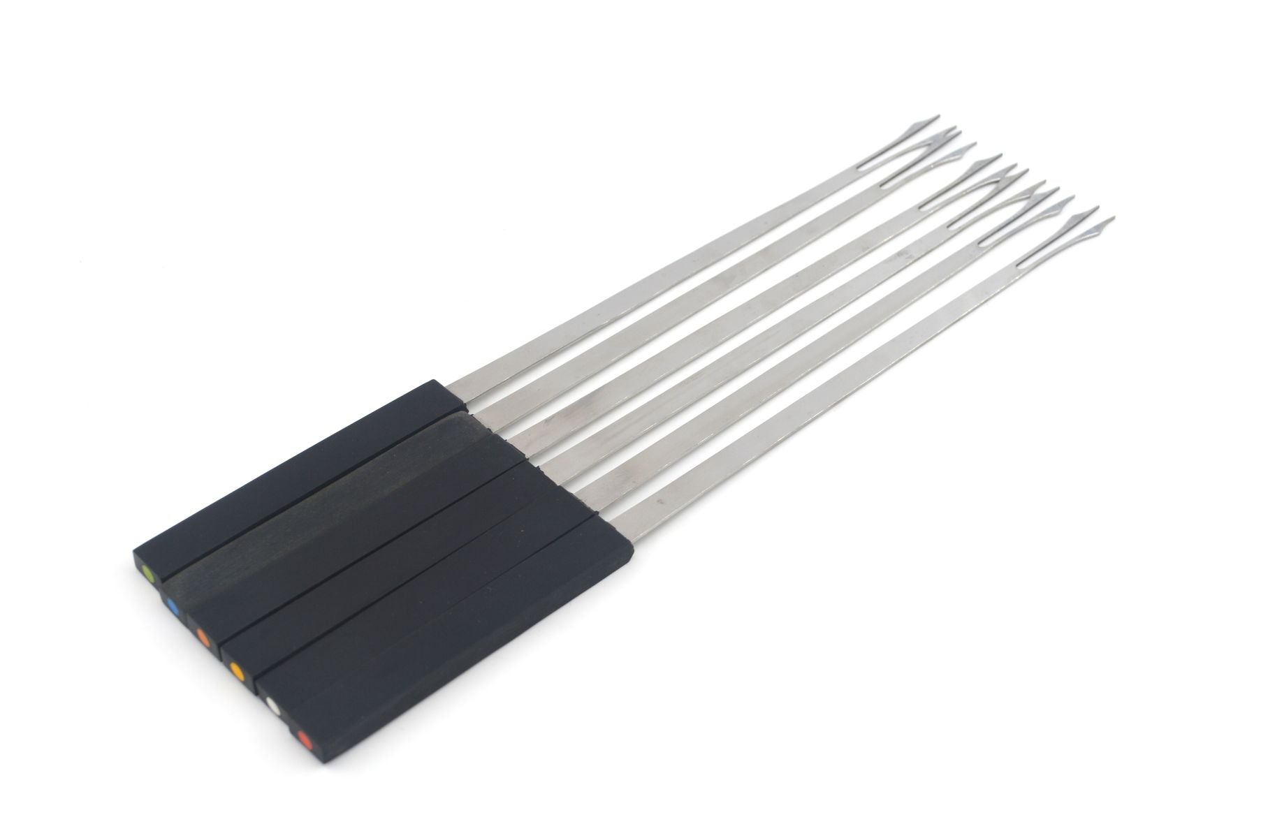 Hier habe ich diese 6-teiligen Fonduegabel Sets von dem dänischen Hersteller Stelton für Euch. Der Entwurf für diese Fonduegabeln stammt von Peter Holmblad aus dem Jahr 1977. Die Fonduegabeln wurden aus rostfreiem Stahl gefertigt und besitzt quadratische Griffe aus schwarzem Kunststoff, welche an der Stirnseite mit einem kleinen farbigen Punkt versehen sind. Die Kombination aus schlichter Formgebung und zeitlosem, modernen Design haben hier ein unverwechselbaren Designklassiker geschaffen. Für Liebhaber von skandinavischem Mid-Century Design darf dieses stilvolle Besteck nicht fehlen. Weiteres hochwertiges Designgeschirr findet Ihr in meinen weiteren Annoncen.