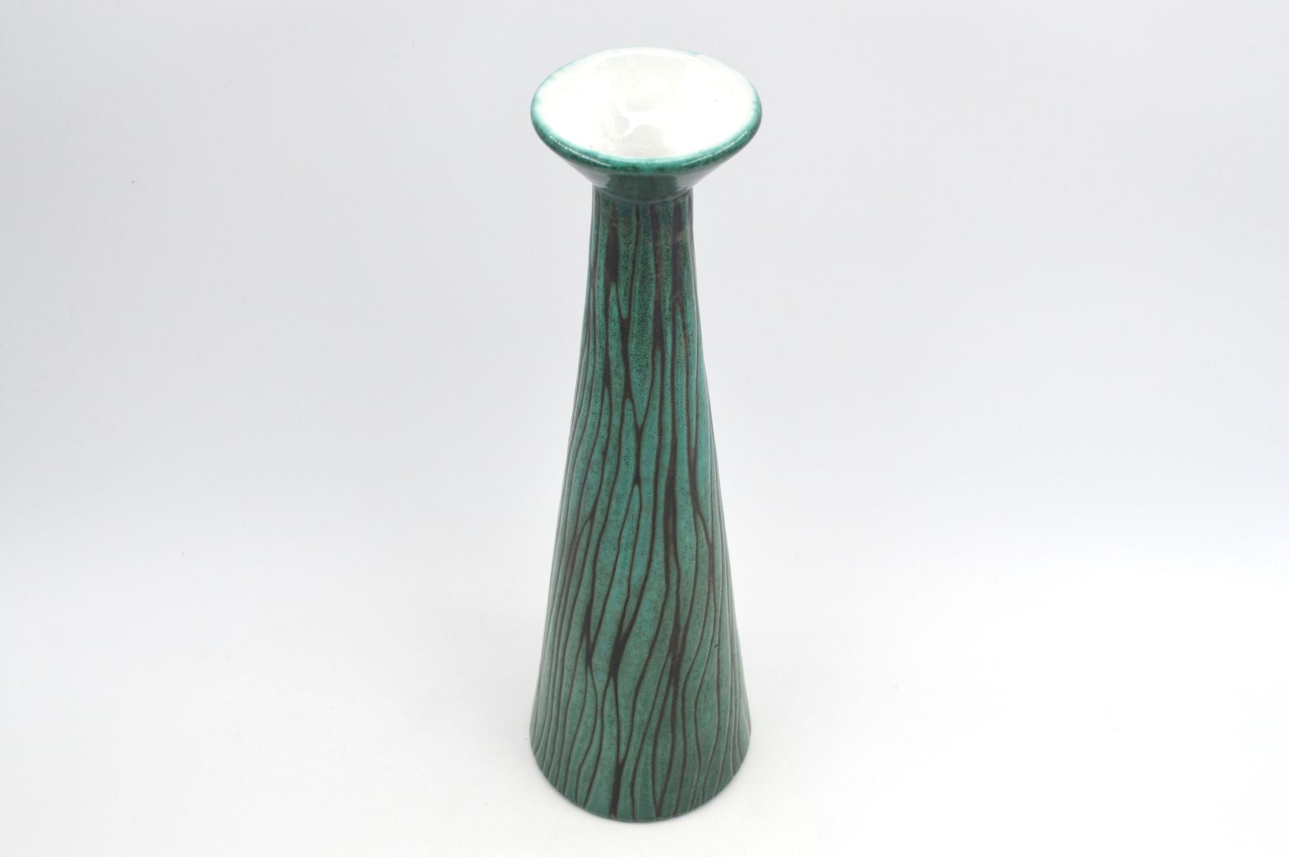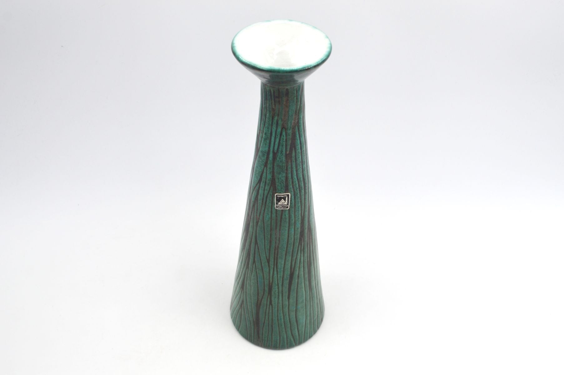Hier habe ich diese große Keramik Vase aus der Graverens Pottery in Norwegen für Euch. Die Werkstatt produzierte von 1852 bis 1982 Keramiken verschiedenster Art. Bis 1926 wurden ausschließlich Keramiken aus braunen Scherben gefertigt, in Folge dann künstlerische Keramiken mit farbenfroher Bemalung und aufwendige und farbenfrohe Designs. Diese außerordentlich schön gestaltete Vase mit der Nummer 779/404E wurde in dem 1950er Jahren handgefertigt. Auffallend ist neben der Größe vor allem der baumartige Dekor auf der Außenseite. Die intensive grüne Glasur setzt sich deutlich von dem ansonsten schwarzen Untergrund ab und schafft eine einzigartige modernistische Optik. Diese Vase ist ein repräsentatives Kunstobjekt norwegische Kunstkeramik und ein absoluter Blickfang. Weitere skandinavische Studiokeramiken findet ihr in meinen weiteren Annoncen.