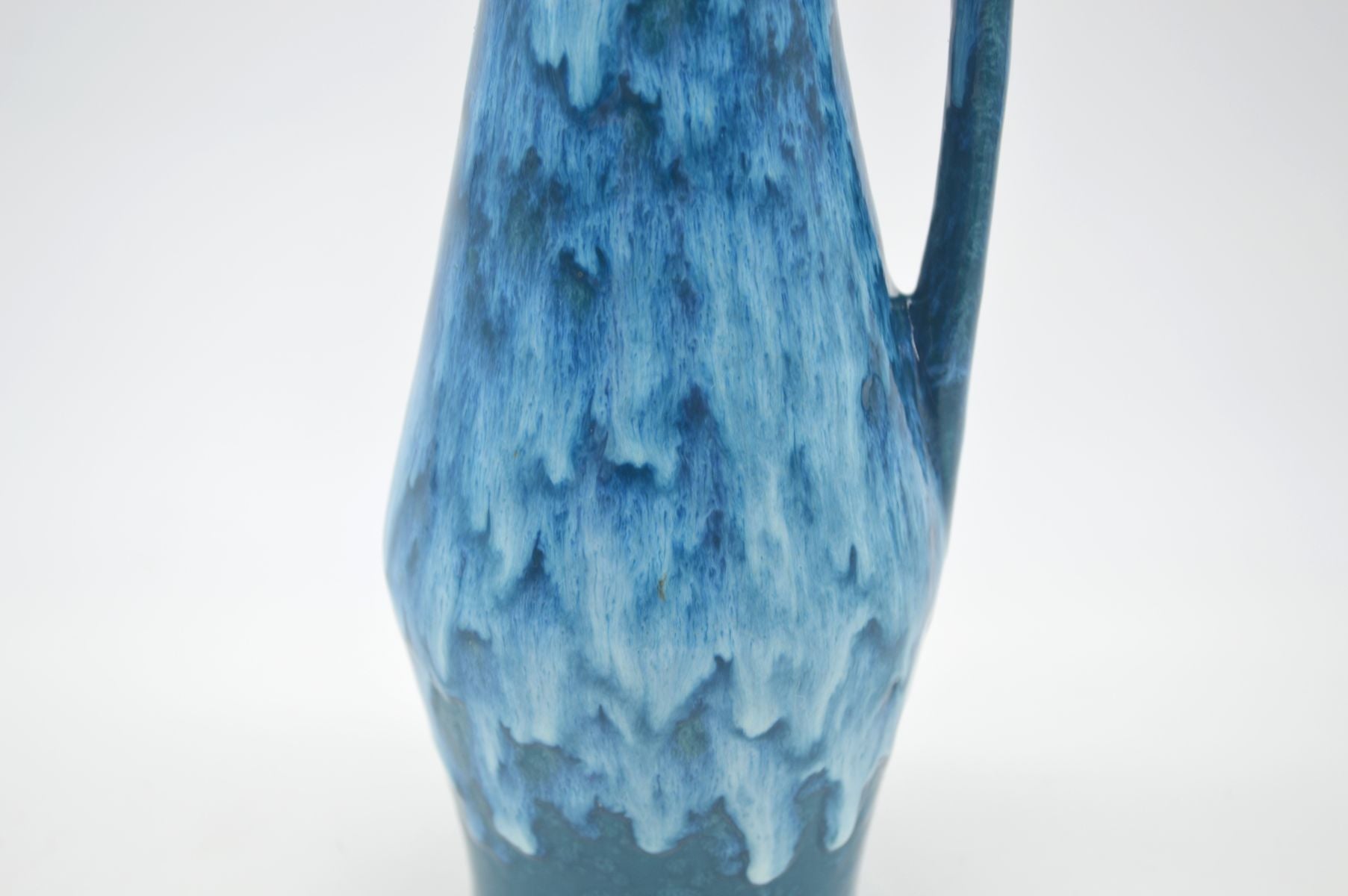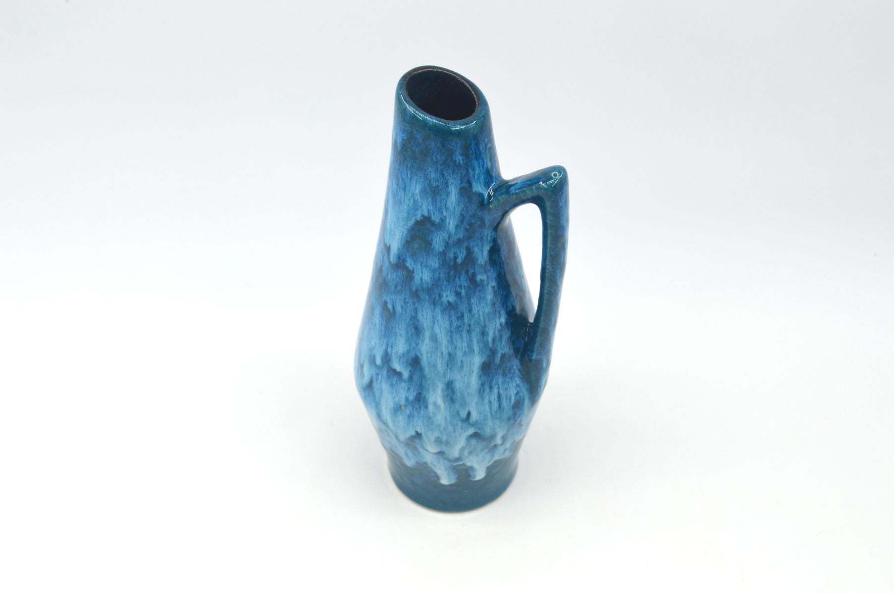 Hier habe ich diese formschöne Vase von dem westdeutschen Hersteller Scheurich Keramik für Euch. Das 1928 gegründete Unternehmen Scheurich Keramik ist für seine farbenfrohen Fat-Lava Keramiken aus den Jahrzehnten um 1960- und 70 bekannt. Der Designer Heinz Siery (1922 – 2022) entwarf in dieser Epoche viele bekannte Designs für Scheurich. Das Modell 271/22 zählt zu den bekanntesten Scheurich Modellen und wurde 1959 von Heinz Siery entworfen. Diese Vase fällt besonders durch die kräftigen Farben in kontrastreichen Blautönen auf, was diese Vase zu einem farbenfrohen Akzent auf Mid-Century Mobiliar macht. Viele weitere Keramiken aus Westdeutscher Produktion findet ihr in meinen anderen Annoncen.